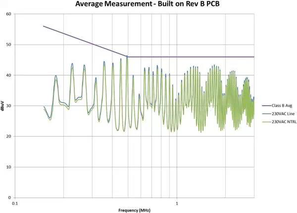 圖3是修改后的效果圖。我們在故障點位置為EMI規(guī)范獲得了大約6dB的裕量。此外,我們還顯著減少了總體EMI簽名。所有這些改善都僅僅是因為布局的調(diào)整,并未改變電路。如果您的電路具有高電壓開關(guān)并使用了屏蔽距離,您需要非常小心地對其進(jìn)行控制。