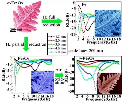 文獻(xiàn)鏈接:Hierarchical Dendrite-Like Magnetic Materials of Fe3O4, γ-Fe2O3, and Fe with High Performance of Microwave Absorption